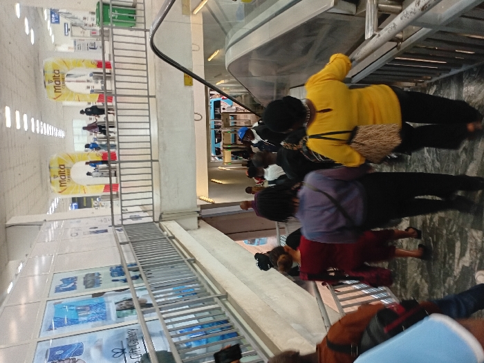The image displays a multi-level indoor public transit concourse, identified as the Oshodi Transport Interchange in Lagos, Nigeria. The viewpoint is from a landing, looking downwards at a wide set of stairs and across to an upper level. In the foreground and midground, approximately ten individuals are descending a broad staircase with light-colored, possibly marble-patterned, tiled flooring. The stairs are bordered by silver-toned metal railings. Individuals are dressed in various attire; prominent figures include a person in a bright yellow long-sleeved top and dark trousers carrying a patterned shoulder bag, positioned on the right side of the stairs, and another person in a dark purple shirt and dark trousers to their left. An escalator, partially visible on the right, descends parallel to the staircase. The background reveals a spacious upper-level concourse with a high ceiling fitted with numerous rectangular fluorescent light fixtures. Two large, yellow inflatable arches, prominently branded "Malta," function as entry/exit points or promotional structures, with several individuals moving beneath or standing near them. A green waste bin is located on the far right of this upper level. Along the left wall, large display panels feature various advertisements, one partially reading "Gift Gallery." Below the upper level and beyond the stairs, a segment of a blue and white vehicle, consistent with a bus, is visible, indicating a vehicle loading area on a lower level. People throughout the scene are in transit, moving through the facility.