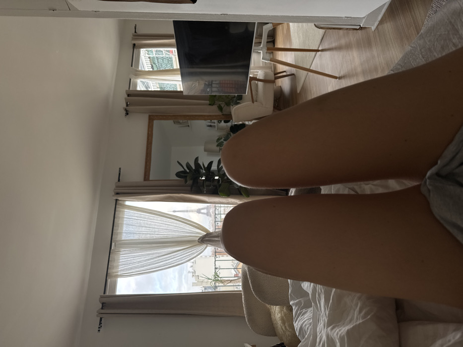 - "The image displays a first-person view from a supine position, looking down at two bare legs in the immediate foreground, partially covered by light grey fabric, resting on a white, crumpled duvet or sheet" by FM-eB9nH2, licensed under CC BY 4.0