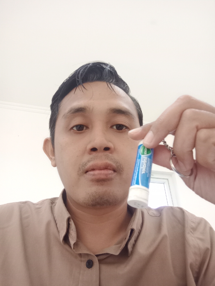 A man poses indoors, holding a small tube with a keychain attached. The tube is white and blue with green markings. He wears a light brown button-down shirt. His hair is dark and styled back, with dark eyes and a light mustache. The background is white with a visible door or window frame. The lighting is bright, suggesting daylight.