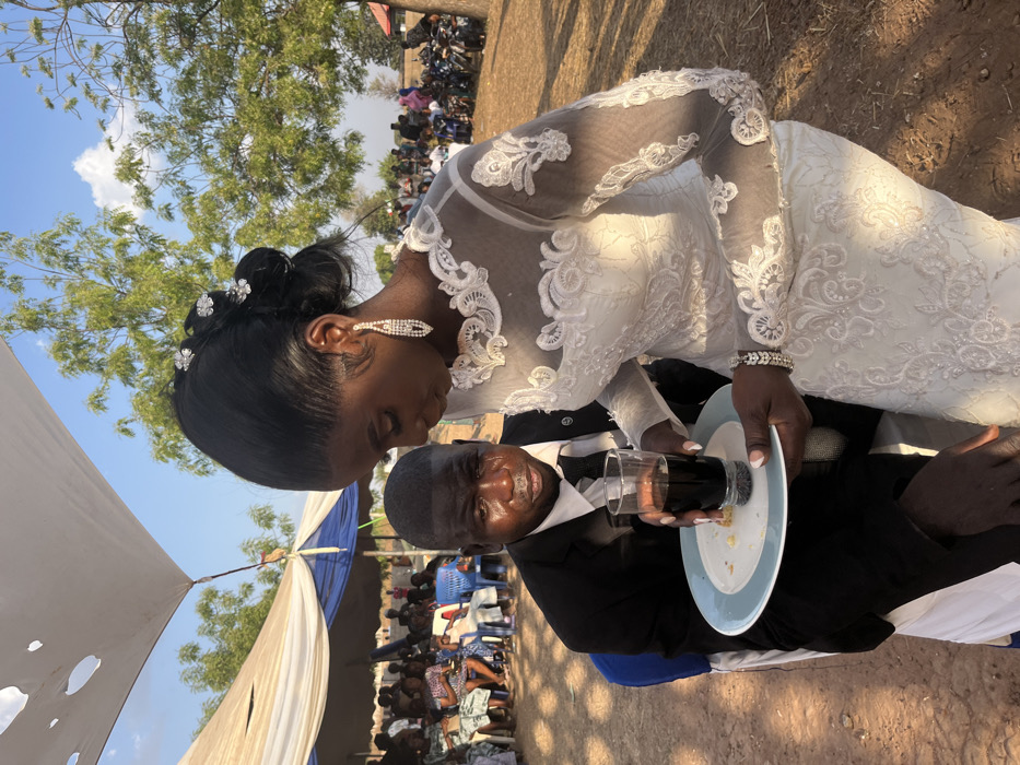 An outdoor scene in a city in Unknown, Nigeria, depicts a man and a woman in formal attire. The woman, positioned centrally and in the foreground, wears a white, long-sleesleeved wedding gown featuring intricate lace and embroidered detailing. Her dark hair is styled in an updo adorned with decorative hairpins, and she wears long, multi-tiered drop earrings and a bracelet on her left wrist. She holds a white plate with a light blue rim in both hands, on which a clear glass containing a dark liquid rests. Her head is tilted downwards, eyes focused on the plate. The man, seated on a blue chair to the left of the woman and slightly behind her, wears a black suit, white shirt, and dark tie. Tears are visible on his cheeks, below both eyes, and his eyes appear moist and red. He looks upwards towards the plate and glass being offered by the woman. In the background, under a white canopy tent with blue accents and visible small holes in its fabric, a crowd of individuals is seated on various plastic chairs and benches. Further back, sparse trees with green foliage are visible against a clear blue sky with scattered white clouds. The ground surface is dry and appears to be dirt or dust.