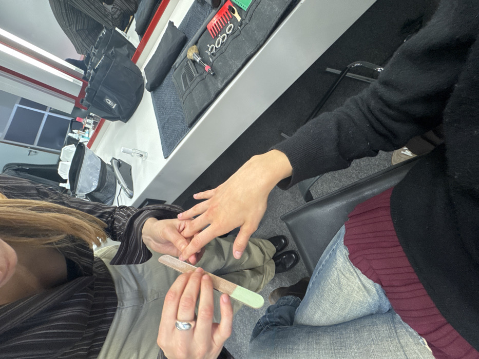 A person files another's fingernails with a wooden file tipped in light green. The manicurist wears a silver ring and a striped blouse. The client wears a black sweater, jeans, and has a maroon fabric layer. A beauty station with tools, bags, and bottles sits in the background. Shoes can be seen beneath them.