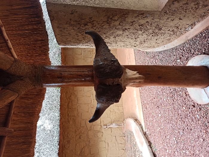 large, dark animal skull mounted on a horizontal wooden beam. The skull features prominent horns. The beam is supported by a stone base and appears to be part of a structure with a thatched roof and stone or brick walls. The ground is covered with reddish gravel. The setting suggests an outdoor or semi-outdoor location with possibly rustic or cultural elements.