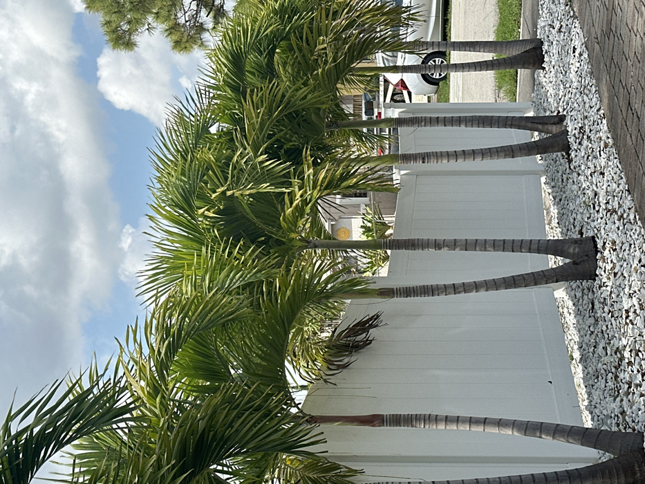 The image displays an outdoor scene in Fort Lauderdale, United States, under a partly cloudy sky. Seven slender palm trees with green fronds are arranged in a linear fashion, spanning from the left to the right of the frame. Their trunks rise from a bed of white decorative gravel, which extends along the base of a white PVC privacy fence. A dark brick-paved sidewalk occupies the lower right foreground. Beyond the fence, a building with a yellow circular decorative element is partially visible, and a light-colored sedan is parked on what appears to be an adjacent street. A conifer tree is visible in the upper right quadrant. No people are present, and no actions or interactions are depicted.