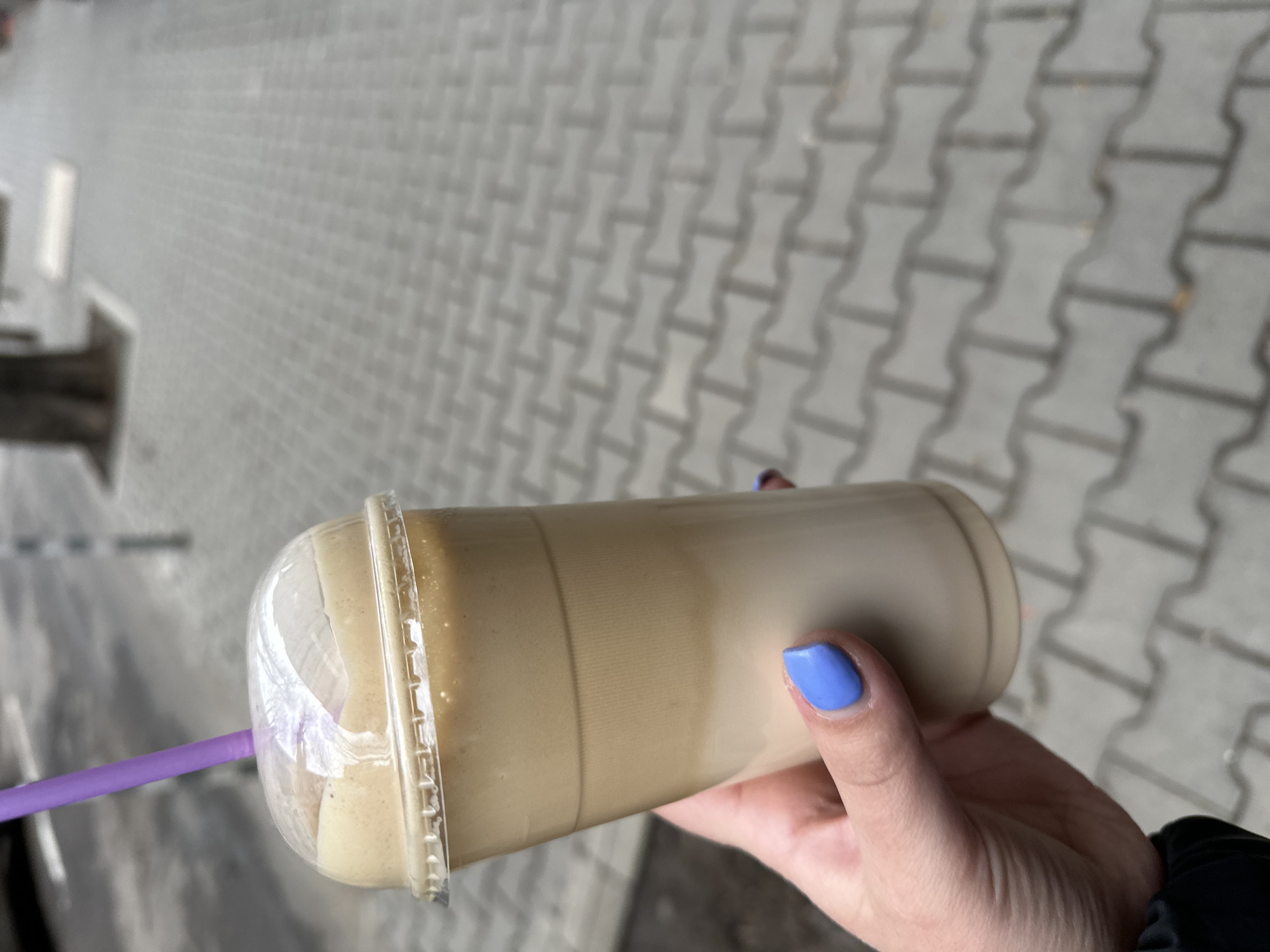 A person is holding a large plastic cup containing a blended beverage, possibly a smoothie or milkshake, with a dome lid and a purple straw. The drink is light brown in color. The person's hand is visible, with blue nail polish. The background shows a paved sidewalk made of gray interlocking blocks. The photo was taken in the city of Sofia, Bulgaria.