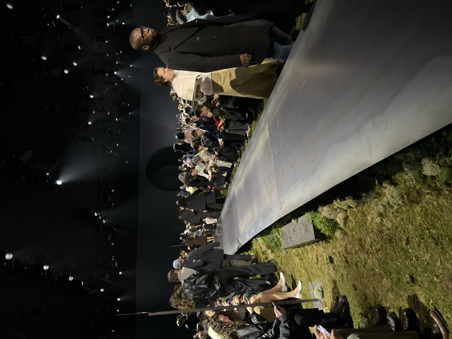 The scene depicts an indoor event, likely a fashion show, taking place within the Grand Palais Éphémère on the Champ de Mars in Paris, France. A wide, metallic gray runway extends from the foreground into the distant, dimly lit hall. Flanking the runway on both sides is a ground cover of dense, green moss and small plants. Spectators are seated in multiple rows along the runway's perimeter, their forms partially obscured by the low lighting. The hall features dark walls and a dark ceiling equipped with numerous overhead spotlights, casting localized illumination on the runway and audience areas. In the far background, a large, dark, arched opening is visible within the back wall. In the foreground, a Black male wearing a dark overcoat and turtleneck, with glasses, walks towards the right side of the frame. To his left, a Caucasian male, dressed in a white shirt and a long light-brown garment resembling an apron or skirt, carries a white tray. On the left side, seated audience members are visible, some engaging with mobile phones. Various other individuals are positioned along the runway, standing or walking, contributing to a crowded pre-event or post-event atmosphere.