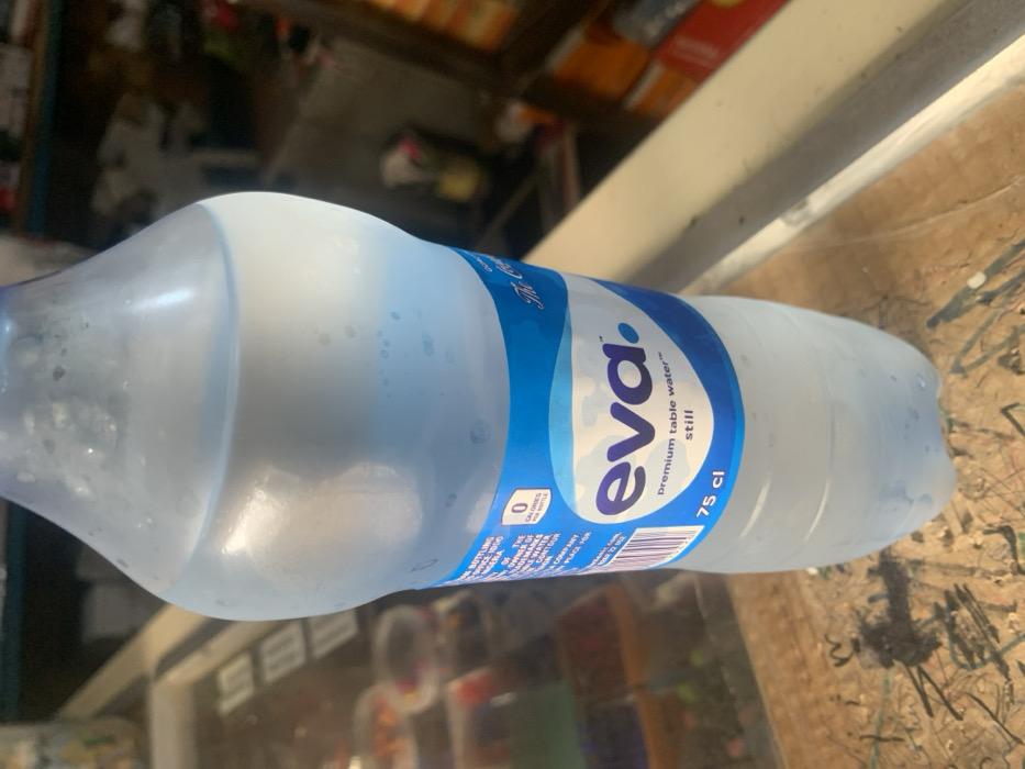 - "The image displays a 75 cl plastic bottle of Eva Premium Still Table Water, approximately three-quarters full and covered in condensation, resting on a scratched light-brown surface" by FM-sUIkK2, licensed under CC BY 4.0