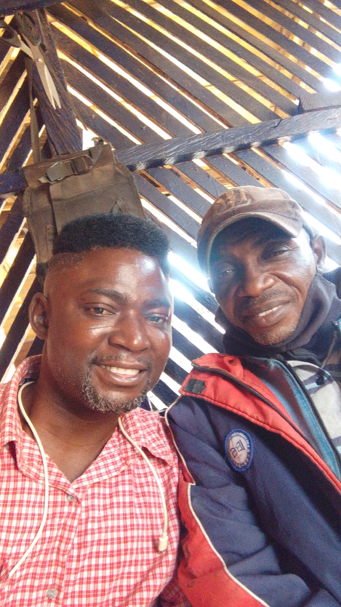 A close-up selfie captured in Sabon Tasha, Nigeria, depicts two adult males posing together under a slatted roof structure