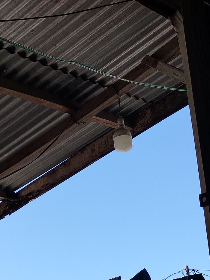 A corrugated metal roof covers the upper frame, supported by weathered wooden beams. A single, frosted light bulb hangs suspended from the wooden structure. An electric wire runs along the underside of the roof. In the background, a clear blue sky provides a contrasting backdrop. A portion of a dark support beam is visible on the right edge of the frame. A glimpse of other structures is seen below.