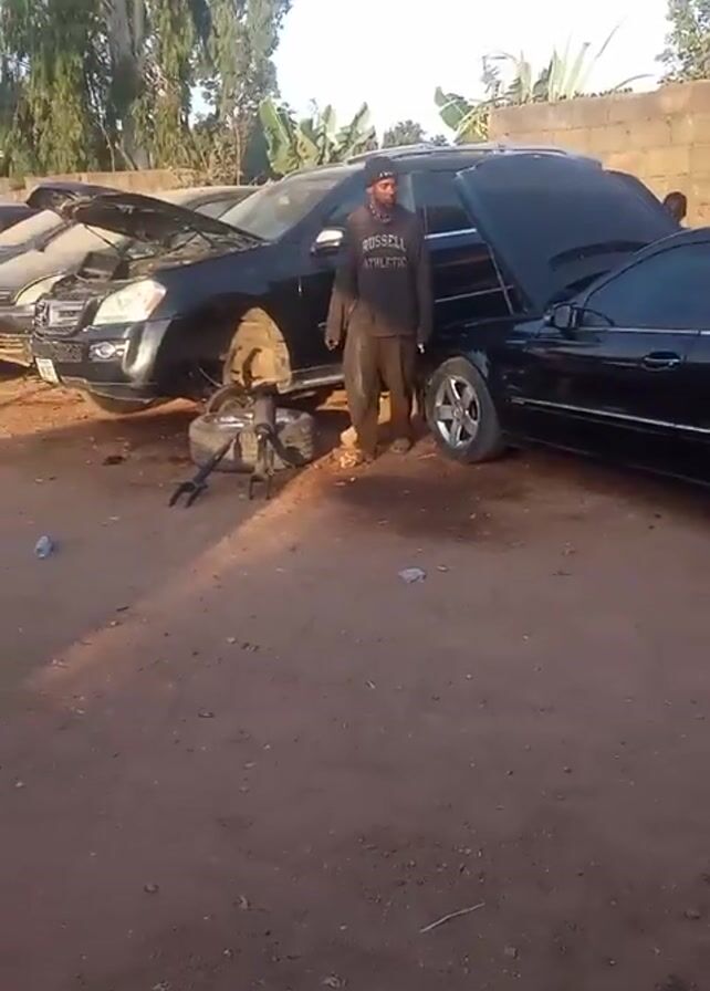 n outdoor auto repair shop. The ground is dirt. Several cars are parked in the lot, many with their hoods up, apparently being worked on. A man wearing a black sweatshirt and a baseball cap stands between two cars. One of the cars he is near appears to be on a jack without its front tire. In the background a child wearing a red shirt walks between the parked cars. A cinder block wall sits in the distance. In the far background stand trees and a building. The sky is bright and sunny.