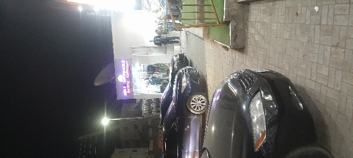 A nighttime view features a well-lit building with a sign reading "W.S. UNDISPUTABLE Luxury Collection." Cars are parked along the side of the building. The ground is paved with square tiles. In the background, an apartment building is visible on the left side. A satellite dish is mounted on the building's side. Metal railings are above the building. The dark sky contrasts with the illuminated storefront.