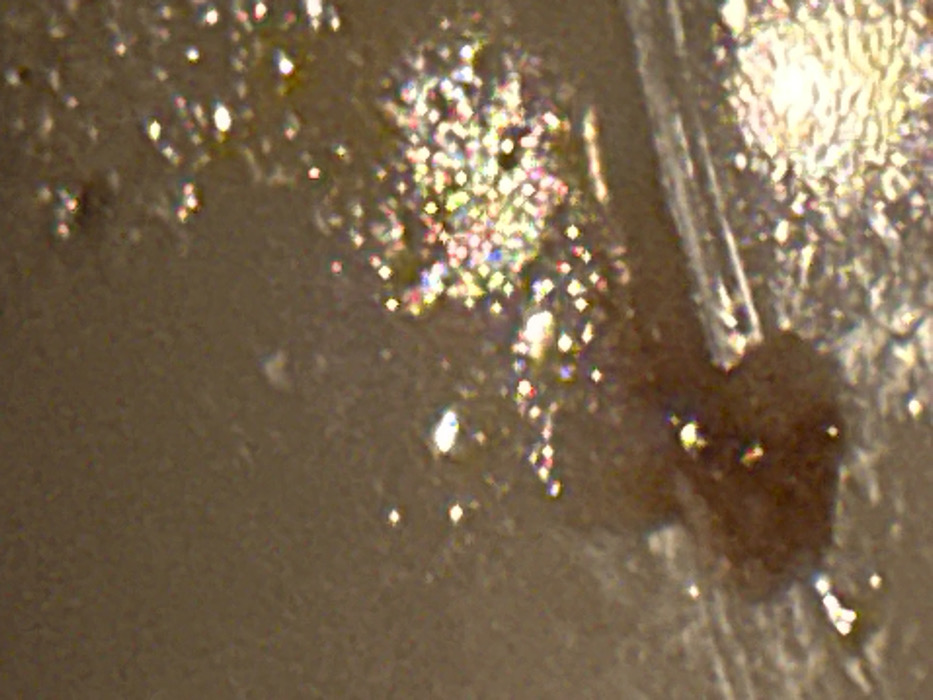 A close-up, somewhat blurry image reveals a textured, predominantly tan surface. A cluster of shimmering, iridescent dots catches the light, appearing near a dark, undefined shape that resembles a blob or smudge. A thin, light streak cuts across the surface near the darker area, possibly a scratch or reflection. The lighting is uneven, creating a mix of bright highlights and shadowed areas.