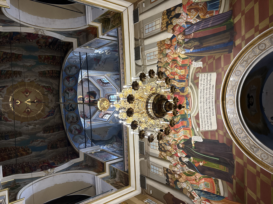 The image depicts the elaborate interior of St. Volodymyr's Cathedral in Kyiv, Ukraine, viewed looking upwards. A large, gilded, multi-tiered chandelier with numerous illuminated electric candle-lights is centrally suspended. Above the chandelier, the main dome's zenith features a golden triangular emblem with a crescent symbol, encircled by Cyrillic text, set against a blue sky with painted angelic figures on clouds. Surrounding vaulted sections and arches are covered with polychrome frescoes depicting biblical scenes and figures. Through an upper opening, a secondary dome is visible, adorned with an icon of Christ Pantocrator and featuring arched windows. The lower walls are extensively covered with detailed frescoes depicting historical or religious gatherings. On the left, two figures in dark monastic robes stand, one holding an unfurled scroll, addressing a large crowd. To the right, numerous figures in ornate robes are seated on a raised platform. The wall frescoes incorporate painted architectural elements such as columns and arched windows. A large inscription in Cyrillic script is present on the wall below the main fresco. The floor in the lower foreground exhibits a red and beige checkered tile pattern, partially revealing an arched doorway.
