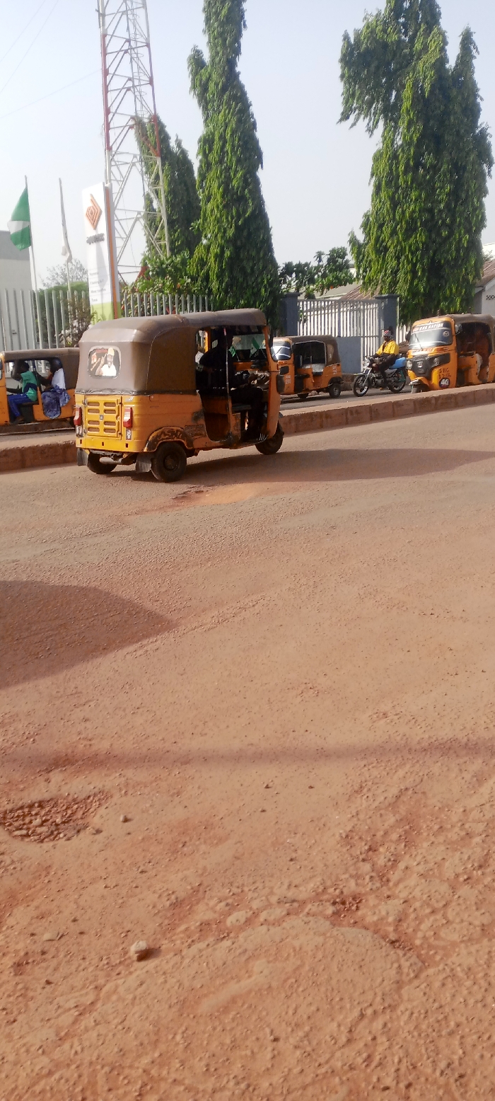 A street scene with several yellow and brown auto-rickshaws parked along the roadside. One rickshaw is closest to the viewer, and the driver is visible. A motorcyclist is waiting behind them. Tall green trees line the back of the scene, with a telecommunications tower and buildings in the background. The road is rough, unpaved and reddish-brown in color. A green and white flag is also visible.