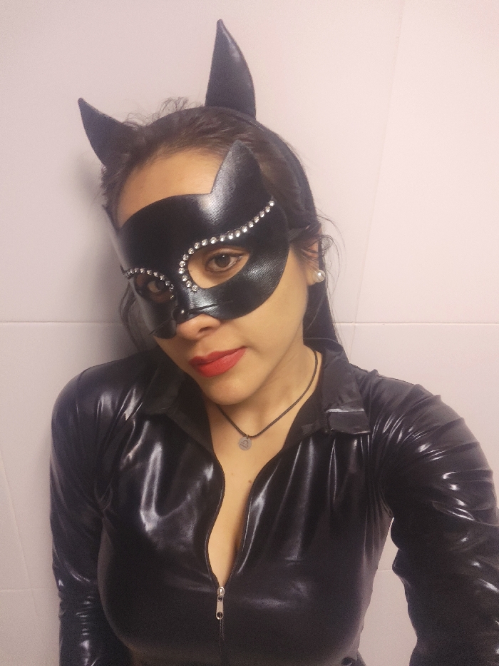 A female subject is depicted in a close-up, chest-up portrait. She wears a black, glossy, long-sleeved jumpsuit or top with a partially unzipped front closure. A black cat-eared mask, adorned with clear rhinestones above the eye openings, covers the upper portion of her face. Her dark hair is visible around the mask and ears. Her right eye is visible through the mask's opening, enhanced with dark eyeliner, and she wears a white pearl stud earring in her right ear. Her nose and mouth are exposed below the mask, with her lips colored in red lipstick. A black cord necklace with a small, circular, silver-toned pendant is visible around her neck. The subject looks directly into the camera with a slight head tilt. The background is a plain, light-colored tiled wall with horizontal grout lines, indicating an indoor setting. No specific city location within Wanchaq, Peru, is discernible from the visual information provided in the image.