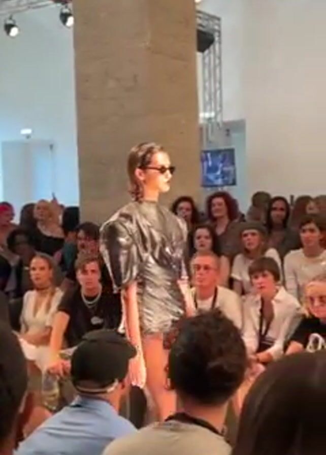 A model walks down a fashion show runway wearing sunglasses, a shiny silver dress, and very short shorts. There are many people in the audience seated on both sides of the runway, most of whom are looking at the model and taking pictures with their phones. The location appears to be an industrial space, with a large cement pillar on one side of the runway and metal lighting rigs above.