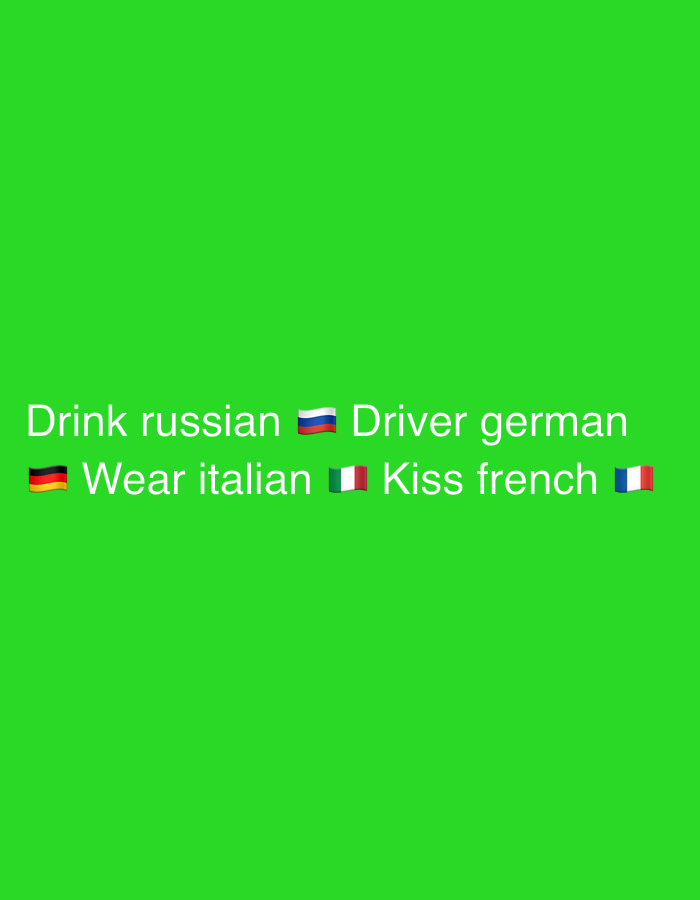 This image is a digital graphic displayed against a solid, vibrant green background. The scene is located in the city of Gerakas Municipal Unit, Greece. Centered horizontally in the lower middle portion of the frame is white sans-serif text presented in two lines. The first line reads: "Drink russian 🇷🇺 Driver german". The Russian flag emoji (🇷🇺) follows the word "russian". The second line reads: "🇩🇪 Wear italian 🇮🇹 Kiss french 🇫🇷". The German flag emoji (🇩🇪) precedes the words "Wear italian", while the Italian flag emoji (🇮🇹) follows "italian", and the French flag emoji (🇫🇷) follows "french". There are no people, objects other than text and emojis, or discernible actions or interactions depicted.