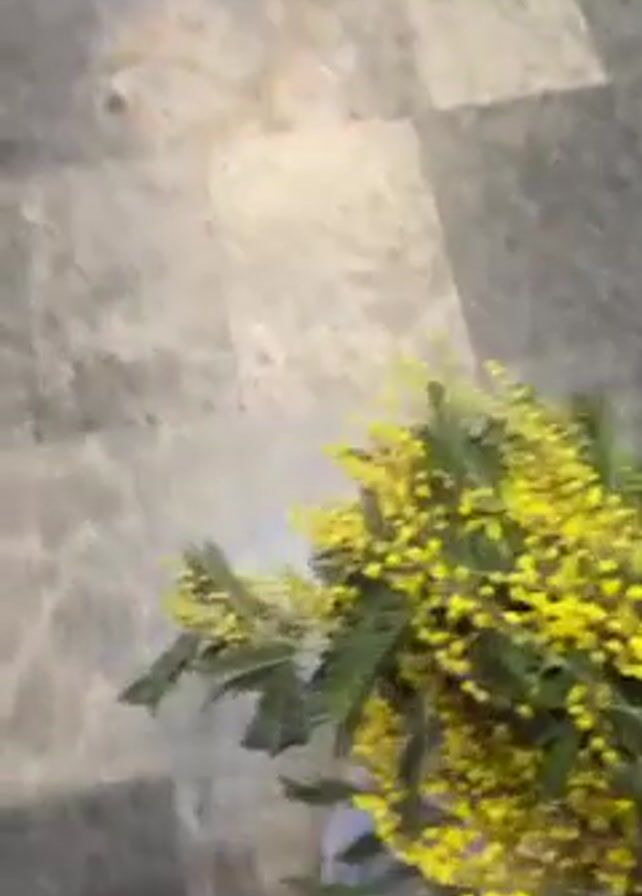 hand holding a bouquet of yellow flowers with green foliage. The bouquet moves slightly as it is held above a floor of grey tiles arranged in a patchwork pattern. The background includes the lower portion of the person's body, showing light blue jeans, a partially visible tan fabric, and a dark blue or black shoe. The lighting is bright.