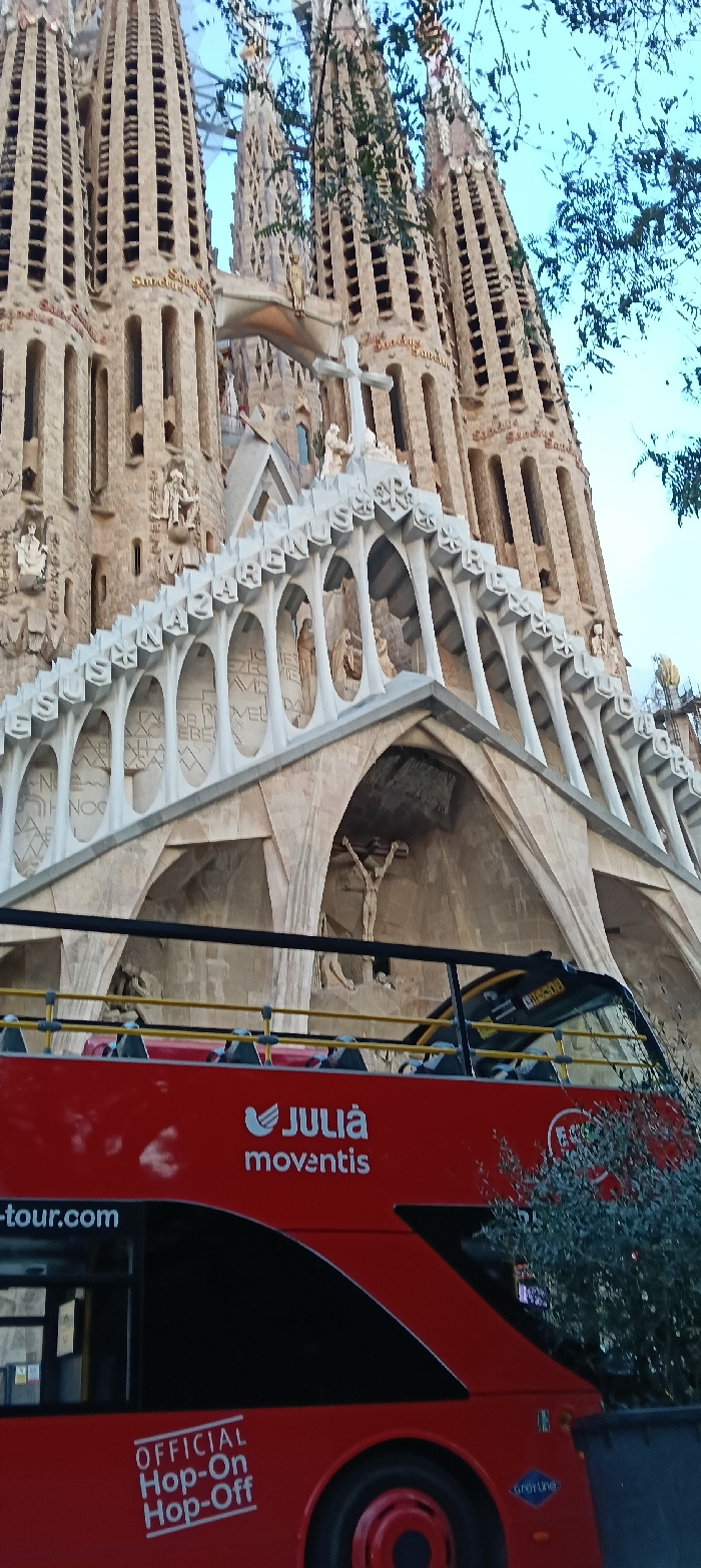 The Sagrada Família soars in the background, showcasing its intricate facade, spires, and religious figures. The architecture features arched walkways and carved details. In the foreground, a red double-decker tour bus labeled "Julià moventis" and "OFFICIAL Hop-On Hop-Off" is partially visible, indicating a tourist perspective. Some trees and foliage fill the right side of the lower part of the image. The sky is visible at the top.