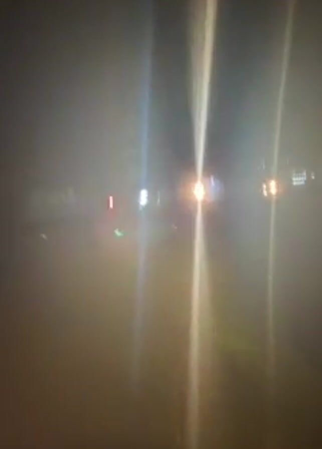 street scene at night. The camera seems to be moving forward along a road, possibly mounted on a vehicle. There are some buildings along the sides of the road. The lighting is poor, mostly from streetlights and vehicle headlights. There's one vehicle that appears to be a motorcycle or scooter passing in front of the camera, headed in the opposite direction. The visibility seems somewhat obscured, perhaps by fog or low-hanging clouds.