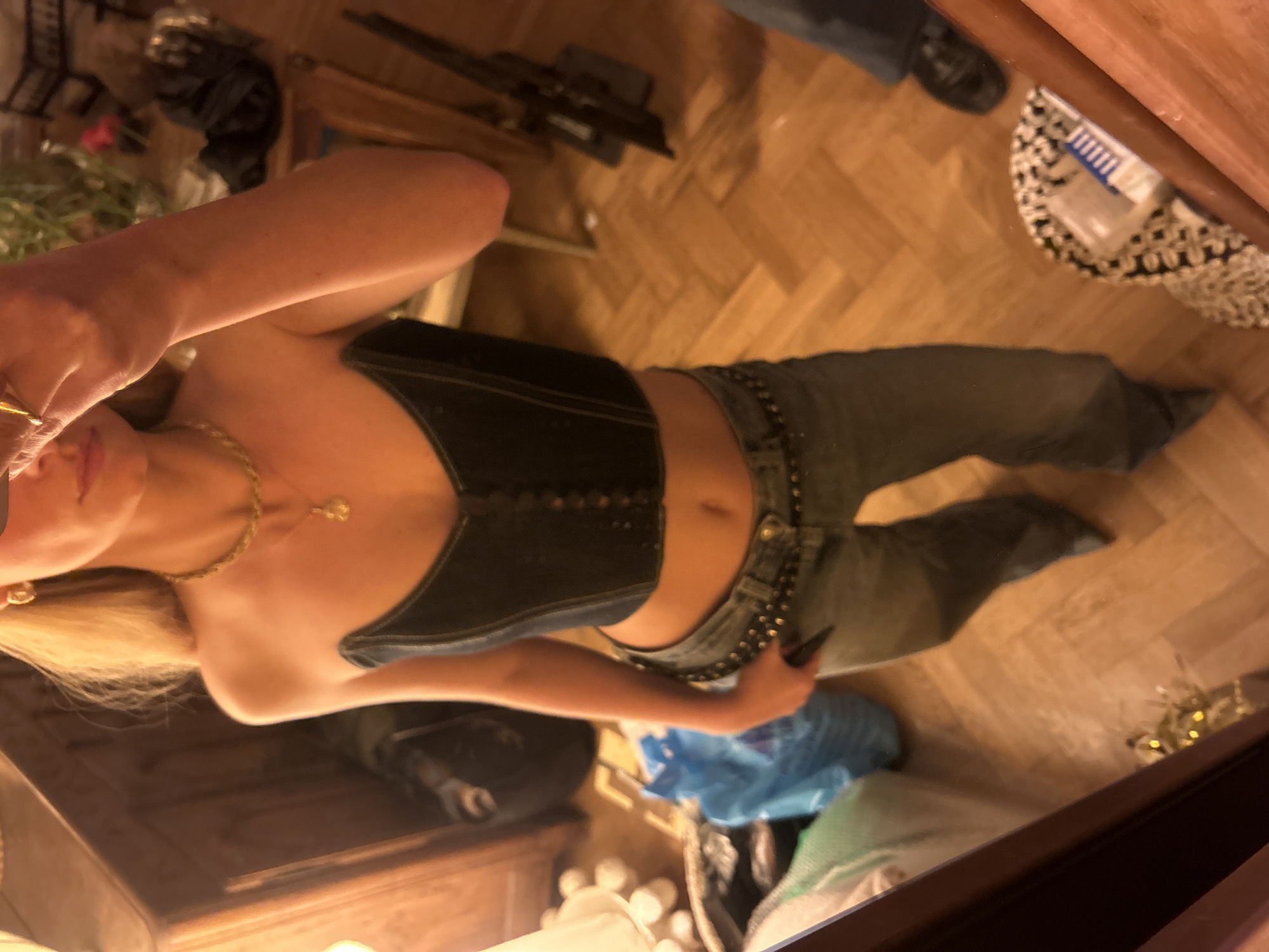 A woman wearing a black corset top and jeans stands in what appears to be a room with wood flooring
