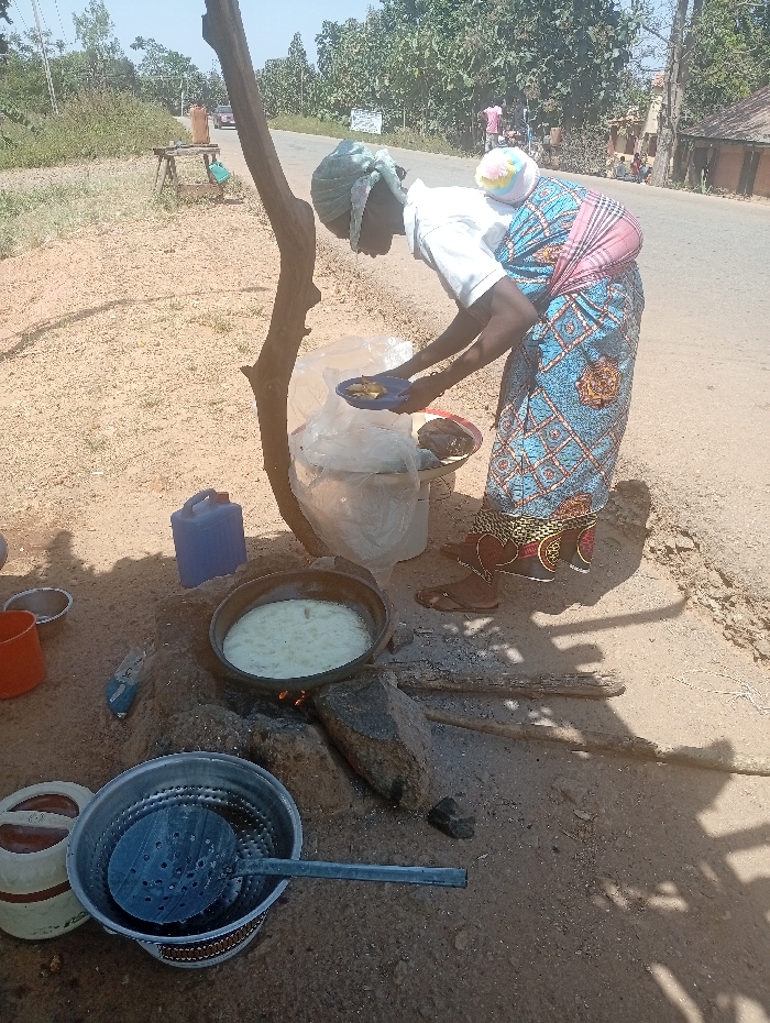 The scene depicts an outdoor cooking operation beside a dirt road in Unguwar Gaya, Nigeria, under bright daylight