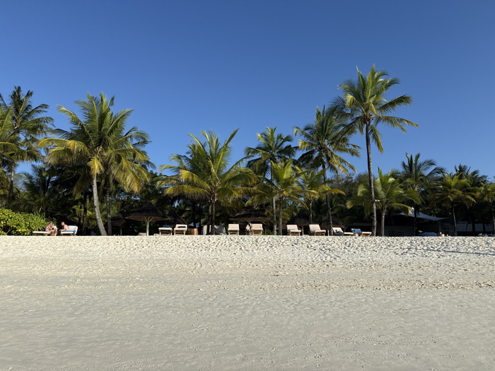 The image depicts a wide-angle view of a sandy beach in Kendwa, Tanzania, under a clear blue sky. The foreground consists of light-colored sand, appearing slightly damp near the bottom, transitioning to drier, lighter sand towards the midground. A line of numerous palm trees with green fronds dominates the middle and background, extending across the entire width of the frame. Beneath the palm trees, several sun loungers with light-colored cushions and dark-framed straw umbrellas are arranged intermittently. On the far left, two individuals are visible; one person is seated upright on a sun lounger, and another is reclining on an adjacent lounger, both positioned beneath the shade of the trees. Behind the line of trees, darker green foliage and hints of obscured structures are visible. The lighting suggests bright daylight conditions, casting subtle shadows from the trees and objects onto the sand.