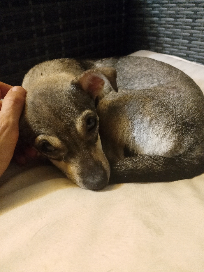 - "A small dog with a brown and grey agouti-patterned coat, featuring lighter tan markings on its face and chest and a distinct lighter patch on its right flank, is curled tightly in a 'C' shape" by FM-QjQR02, licensed under CC BY 4.0