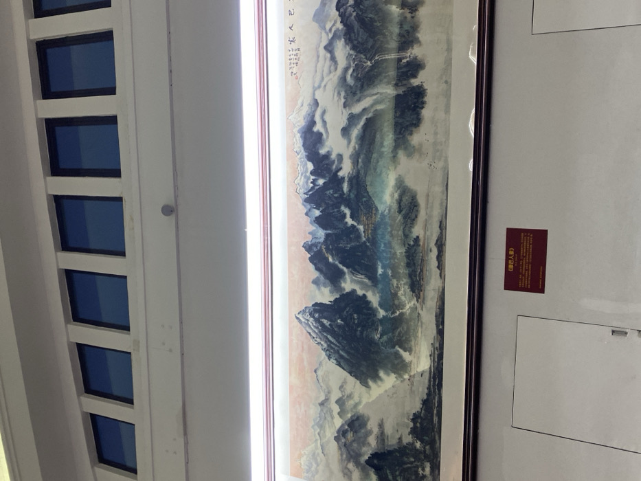 The image displays an interior wall scene within the Former Residence of Qu Qiubai in Dongcheng District, Beijing, China. The upper portion of the white wall features five uniformly spaced rectangular windows with dark blue panes, suggesting tinted glass or reflections. Below these windows, a small, white, spherical security camera is mounted on the wall. The central focus is a large, panoramic Chinese landscape painting, framed in dark brown, depicting steep, mist-shrouded mountains, valleys, and visible waterfalls on the right side, all under a pale sky. Calligraphy is present in the upper right quadrant of the artwork. Below the painting, a red rectangular plaque with white Chinese characters, titled "《瞿家人》" (The Qu Family), is affixed to the white wall. To the left of this plaque, a plain white rectangular access panel or small door is visible. No individuals are present in the scene.