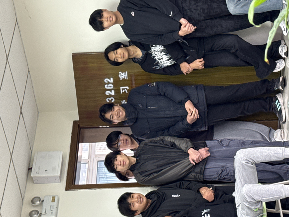 A group of six young men stand in a vertical stack, smiling for a photo in an indoor setting. They are dressed casually, with attire including hoodies, jackets, and jeans, mostly in dark colors. Behind them is a wooden door marked with the number "3262" and two Chinese characters. To the left, a white wall features electrical and utility fixtures.