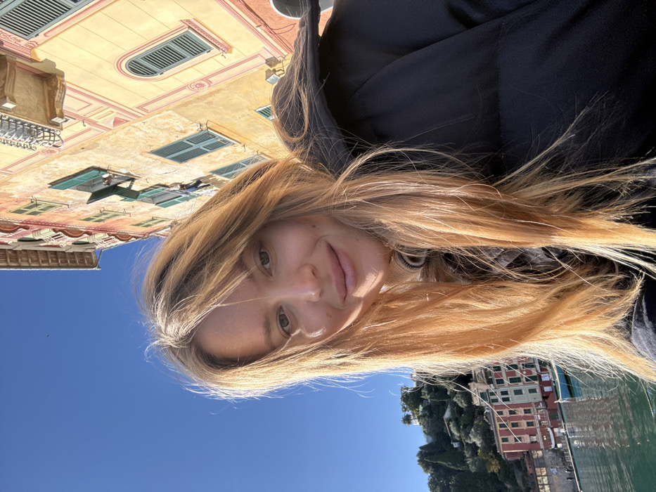 A female subject, centered in the foreground, presents a direct gaze and slight smile. She has long, light brown hair and wears a black puffer jacket over a light-colored high-collared garment. The scene depicts the harbor of Portofino, Italy, under a clear blue sky. In the mid-ground to the left, the calm water reflects light, bordered by colorful buildings and a verdant hillside with sparse structures. A small, blue-hulled boat is partially visible on the water. To the right, a large, multi-story building with a distinctive yellow-orange facade, red trim, and multiple windows with green louvered shutters dominates the upper background. Two individuals are discernible within this building: one leans from an upper-story window, and another, wearing blue, leans from a lower window with an arm extended.