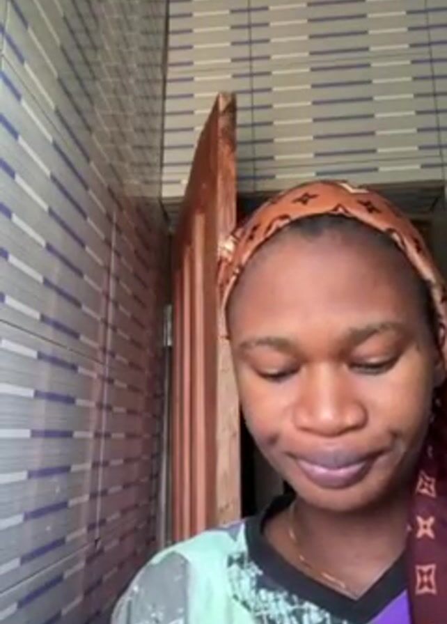 young woman with a brown headscarf, wearing a shirt with purple, green, and black designs. She is indoors, standing in front of a tiled wall with alternating light gray and light gray/blue horizontal stripes. A brown wooden door is also visible. The woman looks at the camera and then lifts her right arm to her forehead, holding a glass dropper filled with a clear liquid. She proceeds to drop the liquid onto her forehead.