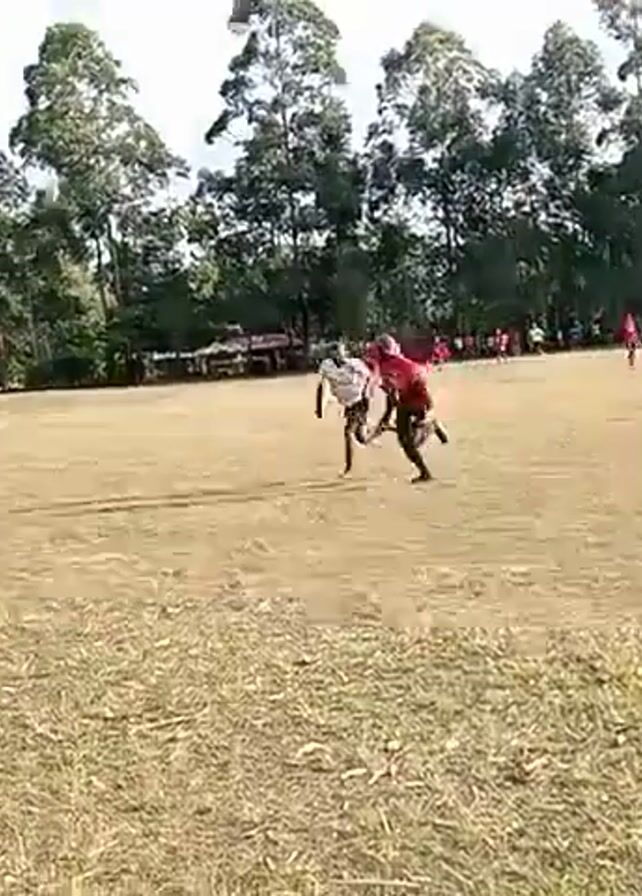 On a grassy soccer field with scattered dry patches, a group of individuals dressed in red athletic jerseys and black shorts are participating in a soccer game. One player, wearing a white jersey and black shorts, is chasing after a player in a red jersey. The player in red jersey is seen jogging after the chase, then stops, appearing winded. The background is lined with tall trees and a wooden fence. In the distance, there are glimpses of small structures. The sky is overcast, and the natural light illuminates the scene.