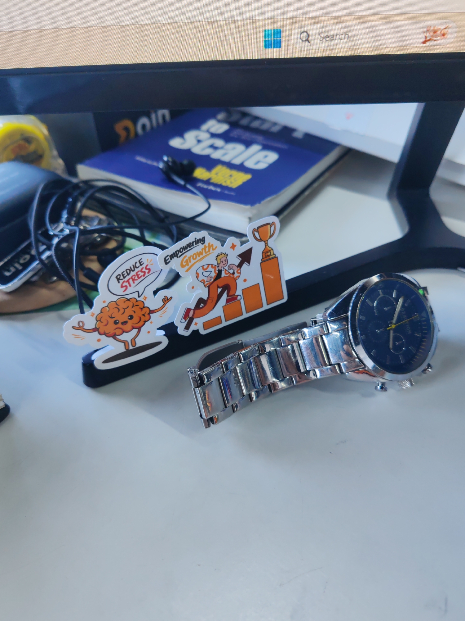 The image displays an indoor workspace, specifically a desk area. The presence of a desktop monitor showing a partial Windows taskbar with a search bar and Windows logo suggests a digital workstation. A black monitor stand supports the display. On the light-colored desk surface, a silver-toned wristwatch with a dark blue chronograph dial and a metal link bracelet rests on its side, positioned in the lower right quadrant. The brand "REACTION" is visible on the watch dial. To the left of the watch, two small, colorful standees are arranged on a black base. The left standee features an orange, anthropomorphic brain character with the text "REDUCE STRESS" in a speech bubble. The right standee depicts a figure in orange attire climbing steps towards a golden trophy, accompanied by the text "Empowering Growth." Behind these items, partially obscured, are black tangled cables and a blue book with the word "Scale" visible on its cover. A yellow object is faintly visible further to the left in the background. No individuals are present in the scene, and no specific markers identify the location as Dhaka, Bangladesh, based solely on the visual evidence provided.