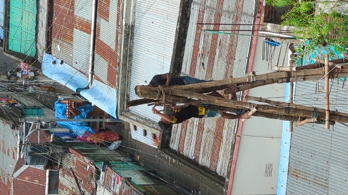 - "Two men are observed working on a tall, makeshift bamboo structure above a collection of corrugated metal rooftops in Narayanganj, Bangladesh" by FM-9iqtw2, licensed under CC BY 4.0