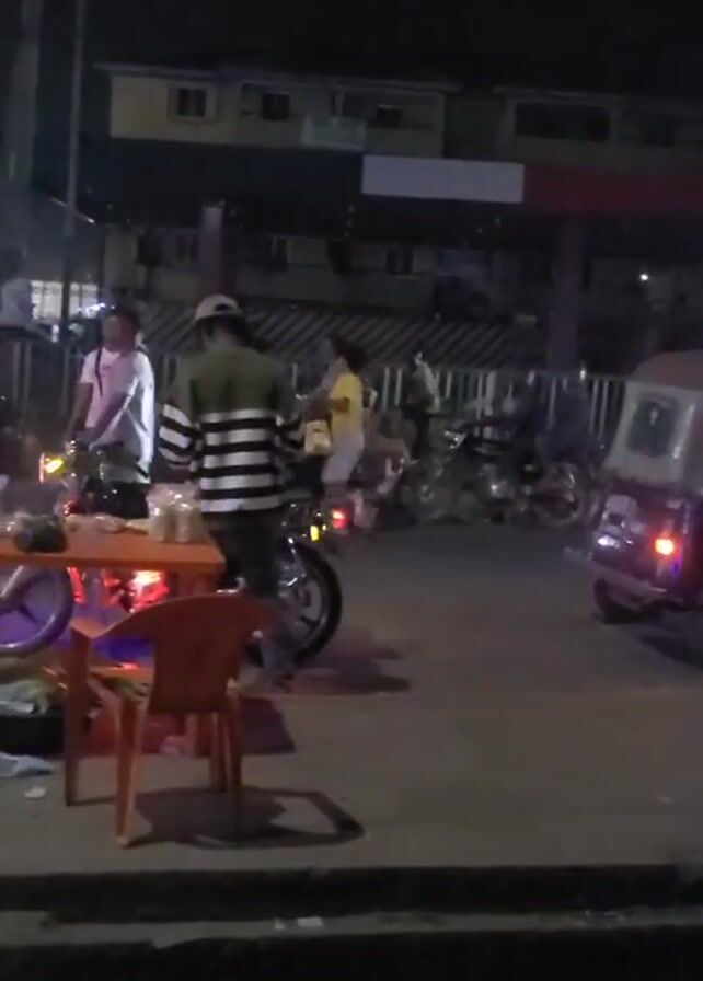 street scene at night. Several people are milling about, some standing near motorcycles and a small vehicle, others walking by. A man in a striped shirt is near a motorcycle, and a couple walks in front of the camera. The woman has long braids and is wearing a white shirt and dark shorts. The man is wearing a red shirt and light-colored shorts, carrying a yellow bag. The background shows a building with lights on and a street light illuminating the scene. The overall atmosphere appears casual and lively.