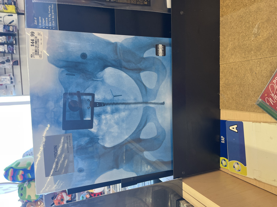 The image depicts the interior of a retail store, likely in the music or entertainment section. The precise location within the city of Edmond, United States, is not discernible from the visual information provided. The central subject is a vinyl record album displayed upright in a black, multi-tiered retail rack. The album, identified by a sticker as "Lorde - VIRGIN (Bathwater Vinyl)," features a blue-tinted X-ray image of a human pelvis on its cover. A prominent vertical element resembling a zipper extends through the center of the pelvic area, terminating in a T-shaped object consistent with an intrauterine device (IUD) at the bottom. Above the pelvis, a dark, rectangular object resembling a smartphone held by a selfie stick mount is visible. A white price sticker in the top right corner indicates "$44.99" and "NEW," along with a barcode. A black "PARENTAL ADVISORY EXPLICIT CONTENT" label is located in the bottom right corner of the album cover. To the right of the primary album, a portion of another vinyl record is visible, displaying a tracklist that includes "Dreams," "Linger," "Zombie," "Ode To My Family," and "I Can't Be With You." In the background, out-of-focus plush toys, including green and multicolored characters, are visible on shelves to the left, while other retail products or accessories are stocked on shelving units to the upper right. The foreground shows a light-colored floor, possibly wood or laminate. In the lower-left corner, white dividers with blue and yellow tabs, marked "RAP" and "A," are stacked, indicating music genre or artist categorization. Part of another media case, displaying green and red colors, is visible in the bottom right.