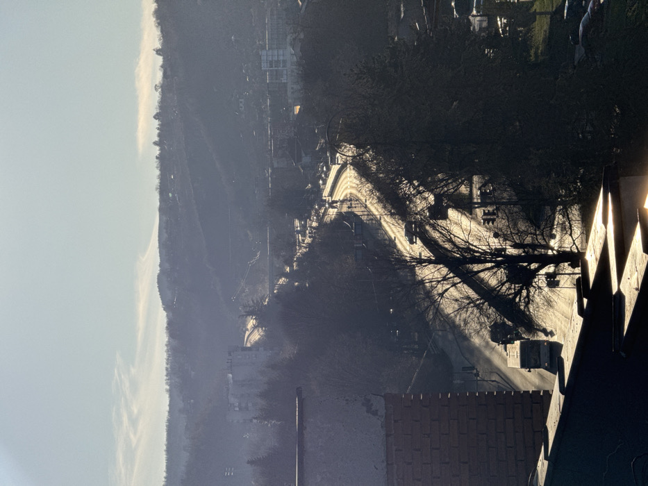 An elevated, long-distance view captures a sunlit, curving asphalt road traversing a valley within the city of Lovech, Bulgaria, likely during morning or late afternoon given the low sun angle. In the immediate foreground, the upper brick facade and concrete ledge of a building, appearing in shadow, partially frame the bottom left of the image. The main subject, a multi-lane road, is brightly illuminated by direct sunlight, which reflects off its wet or shiny surface, creating a bright stripe through the frame. Numerous vehicles, including a white bus and several cars, are visible traveling in both directions along this road. Traffic lights and utility poles stand along the roadside. Large, bare-branched deciduous trees and some evergreens, largely silhouetted against the bright road and distant light, line the thoroughfare and obscure parts of the urban landscape. In the mid-ground, a bridge structure is visible spanning a lower area, with more buildings, including multi-story apartment blocks and what appears to be a larger commercial or industrial complex, scattered among trees on the valley sides. The background consists of gently rolling hills covered in sparse to moderate tree growth, receding into a light atmospheric haze under a clear, pale blue sky with faint, wispy cloud formations. No individuals are clearly discernible.
