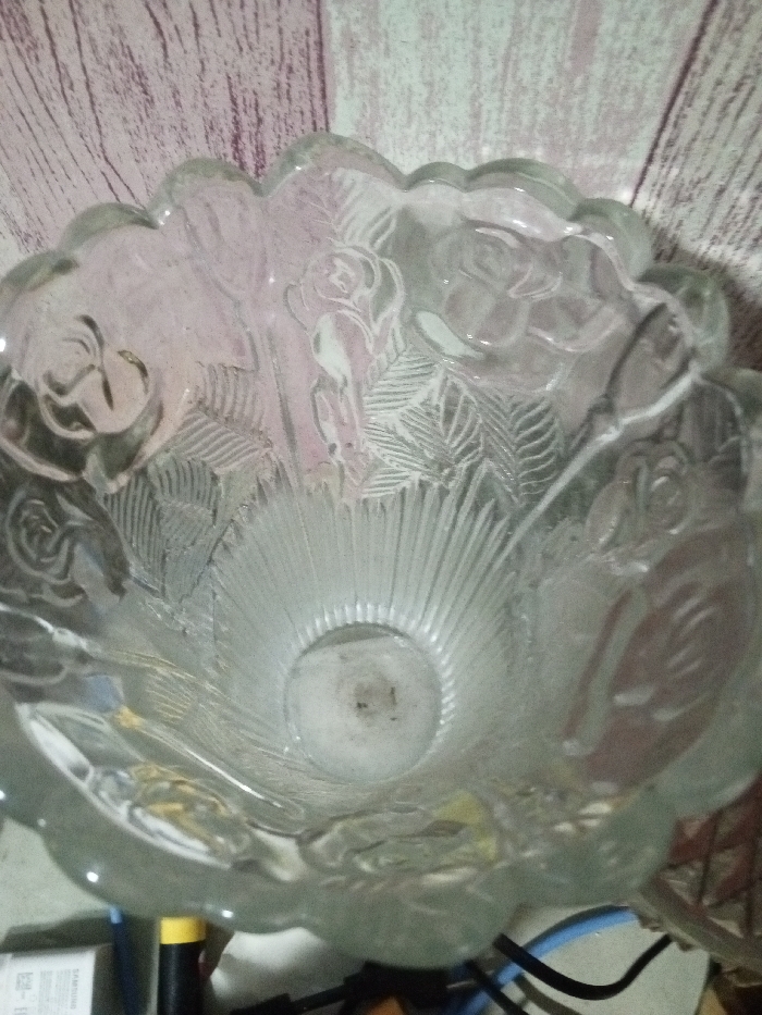 This image depicts a clear glass decorative vessel, likely a vase or bowl, positioned on a surface. The vessel features a flared, scalloped rim and is embossed with a pattern of roses and leaves across its exterior walls. The interior bottom has a central circular area surrounded by radiating vertical ridges. Visible particulate matter or residue is present at the bottom interior of the vessel. The background consists of a light-colored wooden surface with prominent vertical grain. Partially visible in the lower foreground are a black cylindrical object with a yellow band, a white rectangular object, and several dark cables. The scene is located in Longmiang, Laos. No individuals are present, and no active interactions are depicted.