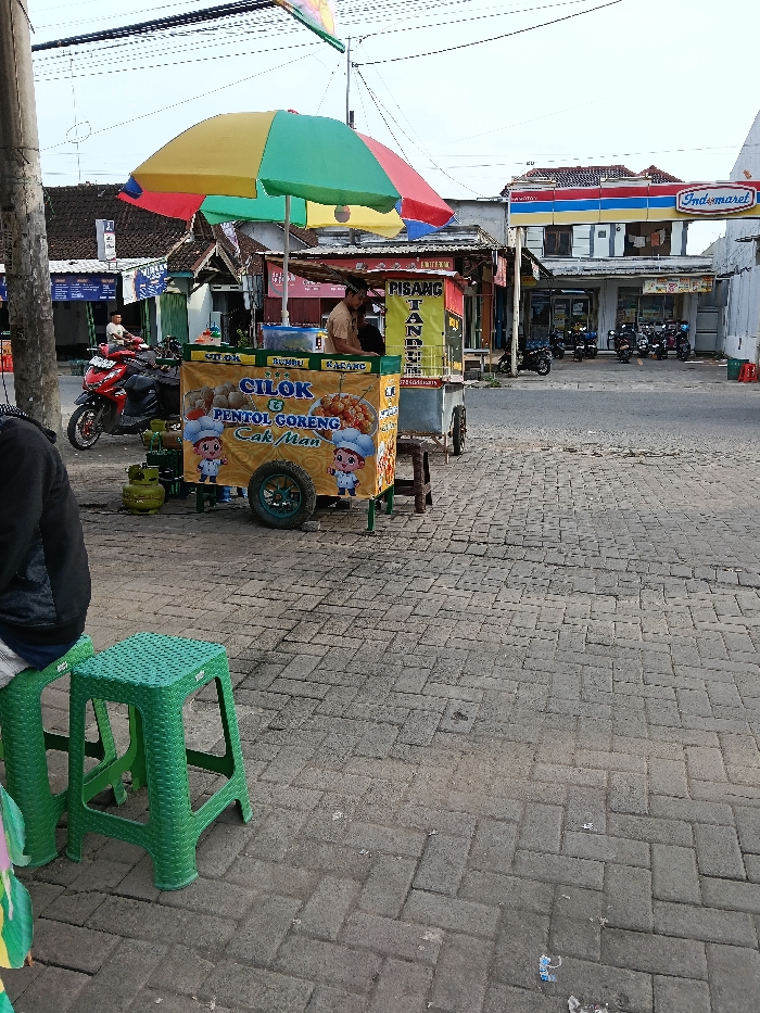 This image depicts a commercial street scene in Pamotan, Indonesia, characterized by street vendors and storefronts under an overcast sky. In the immediate foreground, to the left, are two unoccupied bright green plastic stools with a woven texture. Partially visible on the far left is the torso of a person, dressed in a dark jacket, seated on one of these stools. The ground throughout the foreground and midground is paved with grey interlocking concrete blocks. The central focus is a street food vendor's cart, positioned on the paved area. This cart features a large, multi-colored umbrella with segments of yellow, green, and red. The cart's base is green, adorned with yellow banners depicting cartoon chefs and text that reads "CILOK & PENTOL GORENG CAK MAN" and "BUMBU KACANG." Two green LPG gas cylinders are visible on the left side of the cart's base. Behind the cart, a male vendor, wearing a light brown shirt and a dark head covering, is engaged in food preparation. Adjacent to this main cart, to its right, is a smaller, simpler cart with "PISANG TANDUK" (Horn Plantain) visible on its side. In the background, across a paved road or open area, a two-story building prominently displays the "Indomaret" logo with its characteristic blue, red, and yellow stripes. Numerous motorcycles are parked in front of the Indomaret. To the left of the Indomaret, other commercial or residential buildings with tiled roofs are visible, and a person on a red motorcycle can be seen driving towards the left. Utility lines crisscross the sky above the scene. Litter is scattered on the paved ground in various places.