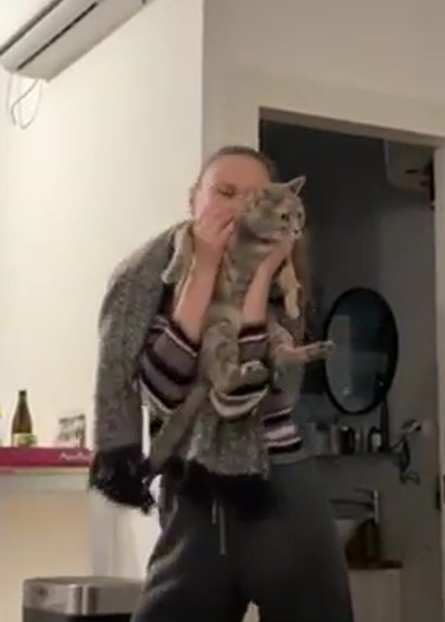 A woman is holding a gray tabby cat close to her face and moving slightly in what seems like a dance. She is wearing a striped sweater, gray sweatpants, and a gray scarf. The cat appears calm in her arms. The background includes an air conditioning unit on the wall, a bar cart with bottles, a stainless steel trash can, and a bathroom visible through a doorway. The overall lighting is bright. The woman is smiling and seems happy to be holding the cat. A sound of water is heard at the end.