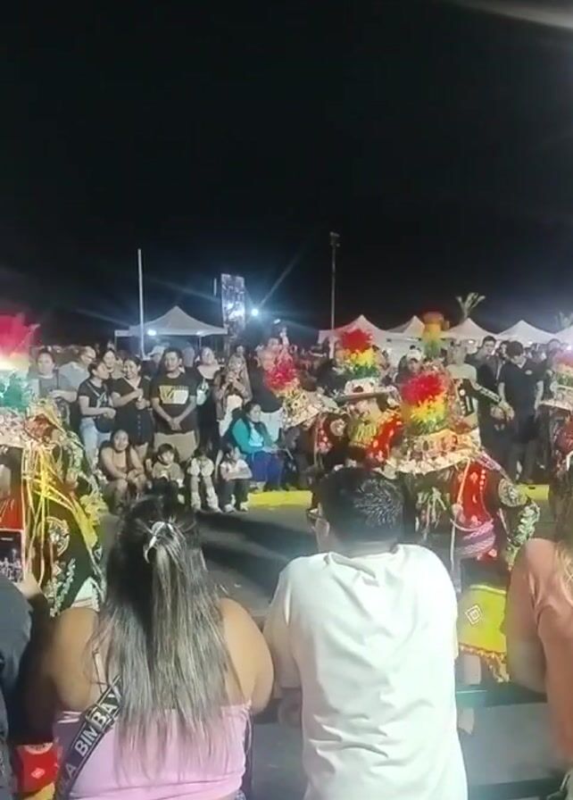 Here's a detailed description of the video: The video shows a crowd of people watching a performance at night. The performers are wearing colorful, traditional costumes with elaborate headwear, some resembling rainbows. They are moving and dancing in a coordinated manner. The audience is diverse, with people of different ages and ethnicities. Many are standing and observing the performance, while some are seated on the ground. A few audience members are holding up their phones to record or take pictures. The environment appears to be an outdoor event space, possibly a fair or festival. There are tents set up in the background, illuminated by lights. A tall light pole is also visible. The sky is dark, indicating it is nighttime. The camera is positioned behind a couple observing the performance.