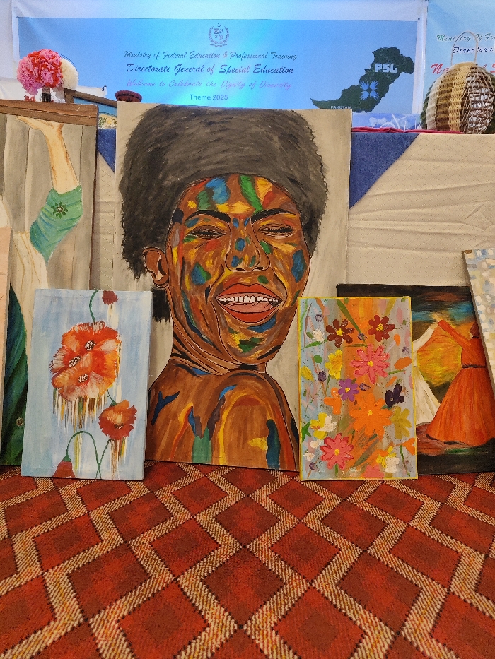 The image depicts an indoor art exhibition in Blue Area, Pakistan, featuring multiple paintings displayed on a patterned carpet floor against a backdrop banner. The foreground is dominated by a red carpet with a diamond-grid pattern in shades of red, orange, and beige. In the midground, several paintings are arranged, primarily leaning. The central and most prominent painting is a vertical portrait of an individual with dark, curly hair and a broad, open-mouthed smile, eyes closed. The subject's brown skin and shoulders are extensively covered in multi-colored paint splotches (blue, green, yellow, red, orange, purple). To the left of this central piece is a smaller, vertical painting depicting two large orange-red flowers resembling poppies, with green stems, set against a light blue background. To the right of the central portrait, another smaller, vertical painting displays numerous colorful flowers (orange, pink, yellow, purple, white) with green foliage on a light blue field. Partially visible on the far left is a painting showing a segment of a human arm in a teal-green patterned sleeve. On the far right, a painting shows a figure in an orange traditional garment, alongside another lighter-colored figure, against a warm yellow-orange background. The background features a light blue banner extending across the top of the scene. The banner displays text including "Ministry of Federal Education & Professional Training," "Directorate General of Special Education," and "Welcome to Celebrate the Dignity of Diversity," with "Theme 2025" noted. The Pakistani national emblem (star and crescent) is visible on the left side of the text, while a map of Pakistan with "PSL" and another logo is on the right. Decorative elements include a cluster of pink floral pom-poms on the far left and a woven, light brown, basket-like object on the far right, both situated in front of the banner.