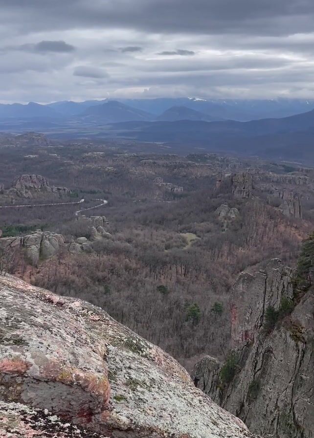 The camera pans across a landscape of rugged rock formations, sparse forests, and distant mountains under a cloudy sky. The foreground features mossy rocks, transitioning to towering, red-tinged rock pillars. These pillars are separated by crevices and are partially covered with sparse trees. In the background, a valley stretches out with a winding road and a mix of bare and evergreen trees. Beyond the valley, a range of blue-tinged mountains is visible against the overcast sky. The overall scene conveys a sense of natural grandeur and remoteness.