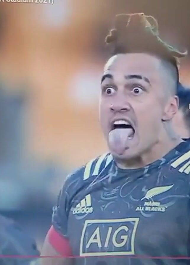 group of male rugby players performing a pre-game ritual. The players are wearing black and grey jerseys with the Adidas logo and the words "ALL BLACKS" and "AIG" printed on them. The player in the center is particularly animated, sticking out his tongue and yelling while gesturing with his hands. He has a distinctive hairstyle with a mohawk and a spiral curl. Other players around him are also yelling and making aggressive facial expressions. They appear to be performing a traditional Maori haka. The game is identified as "Maori All Blacks v Manu Samoa (Mt Smart Stadium 2021)" on the screen. The video is labeled as "sky SPORT LIVE." The background is blurred, suggesting a stadium environment.