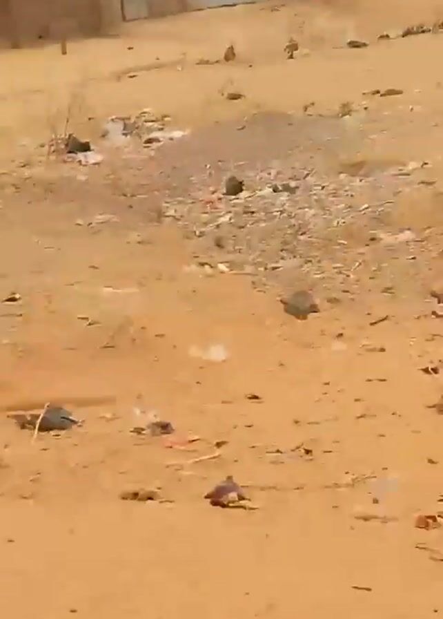 n outdoor scene on what appears to be a dirt ground. There is litter scattered across the ground. Initially, the focus is on the ground, then the camera pans up to show a woman in a dark blue hijab walking along a path. A child walks in the opposite direction, and then a man with a camera and a girl in a pink dress enter the frame and interact, possibly posing for photos. The background includes a brick wall, trees, and simple buildings. The overall setting seems to be in a less urbanized area.