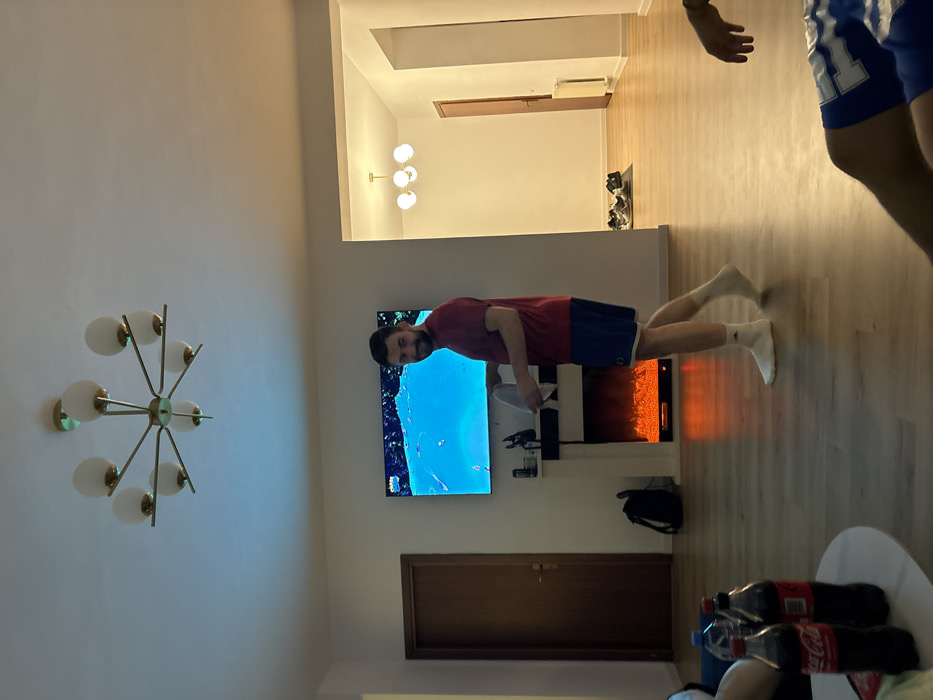 The scene depicts a modern residential interior, implicitly located in Bucharest, Romania. The primary subject is an adult male, of medium build, with dark hair and a beard, wearing a red short-sleeved t-shirt, blue athletic shorts with a white stripe, and white socks. He stands in the middle ground, facing forward and slightly to the right, holding a circular white object, possibly a plate, in his left hand. He is smiling directly at the observer. The room features light-colored wooden laminate flooring and plain white walls. Overhead, an eight-arm chandelier with opaque white spherical shades provides illumination. A large flat-screen television is wall-mounted in the background, displaying an image with a predominant light blue hue. Below the television is a decorative mantelpiece housing an electric fireplace, which emits an orange-red glow simulating flames. To the left of the fireplace is a dark brown wooden door. A black backpack rests on the floor near this door. In the foreground on the left, a white coffee table holds two dark-colored bottles, identifiable as Coca-Cola, and one clear plastic water bottle. A portion of another individual, wearing a blue and white garment, is visible seated to the left of the table. Another individual's leg, wearing blue and white shorts, is partially visible in the bottom right corner of the frame. Beyond an archway to the right of the fireplace, a hallway is visible with several pairs of shoes placed on the floor against the far wall. The hallway also contains a white radiator and another dark brown wooden door. The overall lighting is bright and artificial.