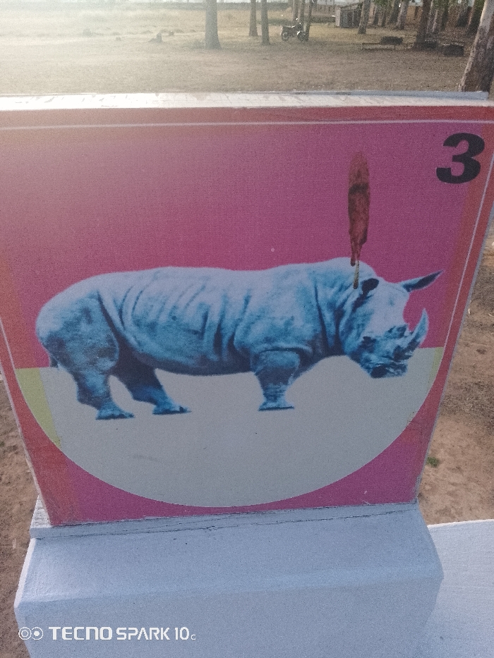 A sign features a rhinoceros image on a red background, situated within a rounded, light-colored section. The number "3" is displayed in the upper right corner. A brown stain or discoloration runs down from above the rhino's head. The sign sits atop a white, blocky base. The background shows a grassy area with trees and a motorcycle in the distance, all under bright sunlight. A watermark from a Tecno Spark 10c mobile phone is visible in the lower left corner.
