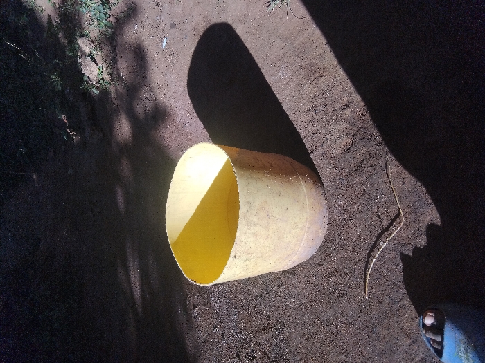 A yellow cylindrical container lies on its side outdoors, partially shaded. The ground appears to be dirt or soil with sparse vegetation nearby. A single piece of straw rests close to the edge of the container. A portion of a foot in a blue sandal is visible in the lower right corner of the image. Shadows cast by trees or other objects cover parts of the scene.
