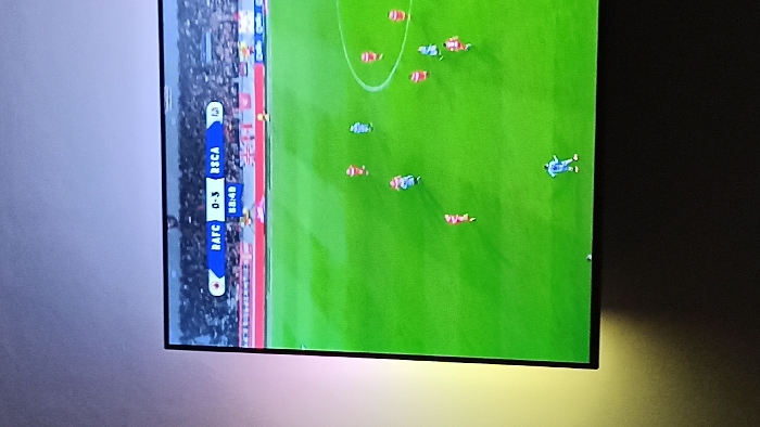 A television displays a soccer match, showing an aerial view of a green field with players in red and blue uniforms. The score is RAFC 0-3 RSCA, with the game time at 88:48. The screen is mounted on a wall with ambient lighting emitting from behind the television.