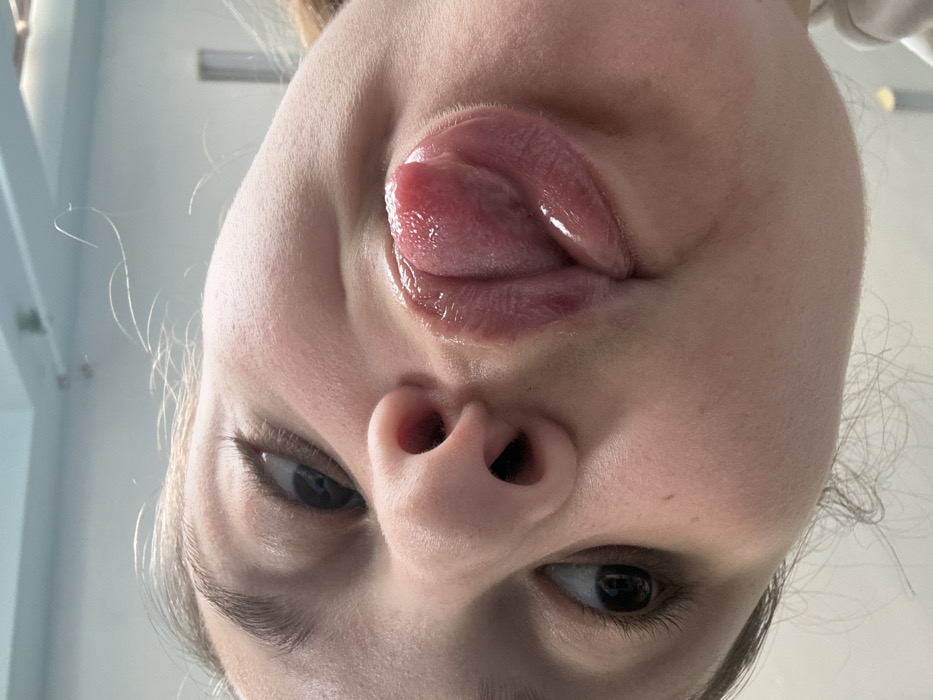A close-up, diagonally oriented image depicts the face of a young individual with fair skin and dark irises. The subject's mouth is open, and a glossy, pink tongue is extended and folded, protruding from the lips. The lips themselves are full and appear hydrated. Both eyes are open, gazing slightly upwards and to the right of the frame. The nose is prominent in the foreground due to the low-angle perspective. Fine, light-colored hair strands are visible along the upper edge of the frame. The background is an out-of-focus indoor environment, characterized by bright, pale blue and white tones, indicating walls and a ceiling with faint linear architectural elements and reflections from overhead lighting. The scene is located in the city of Pleven, Bulgaria.